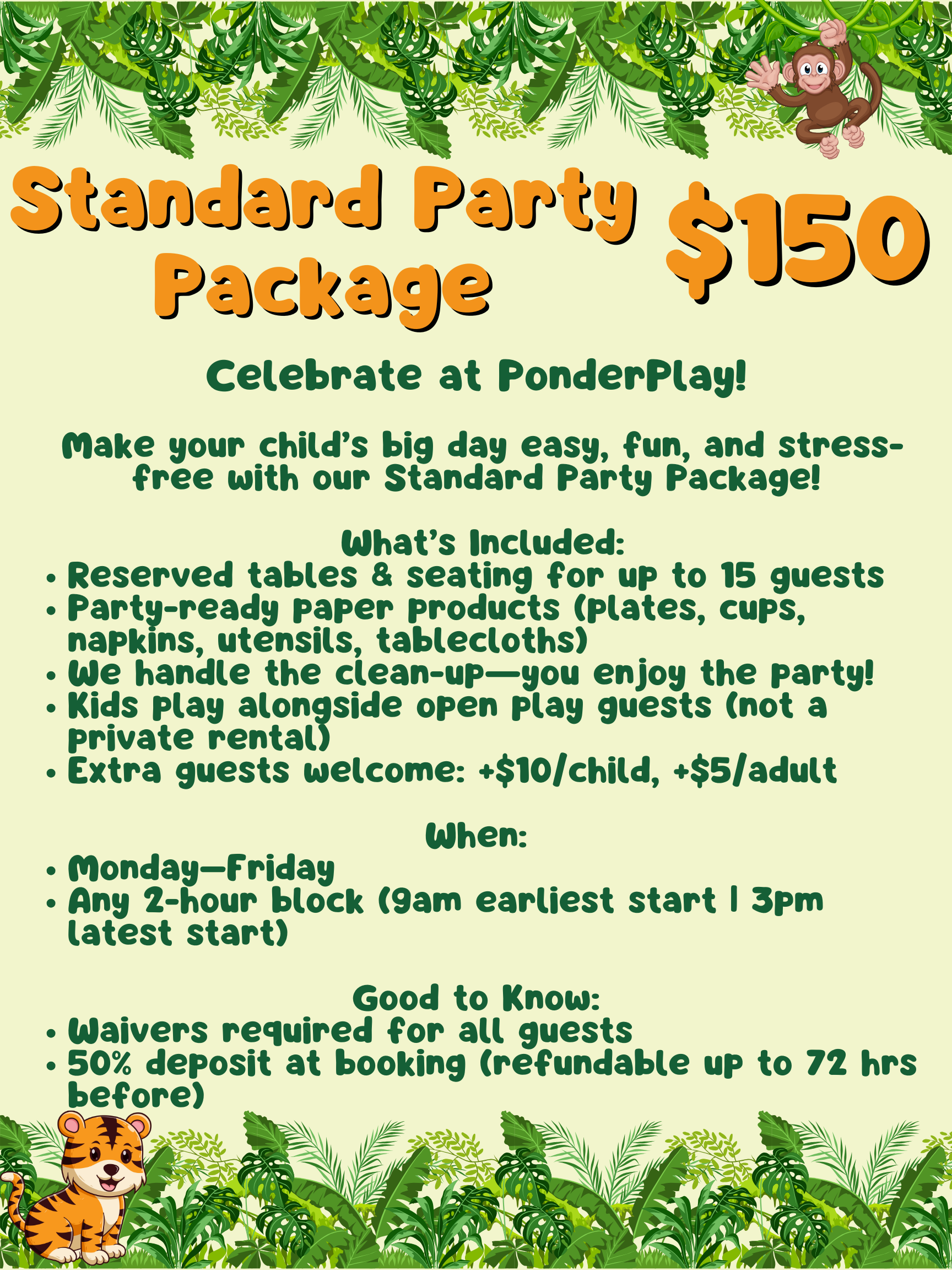Celebrate your child’s big day in a fun, family-friendly atmosphere! Our Standard Party Package includes reserved tables and seating for up to 15 guests (kids and adults), complete with party-ready paper products to make hosting stress-free. You’ll enjoy a guaranteed party space while kids play and explore alongside open players—perfect for those who love a lively, social environment. Need more room? Extra guests are always welcome at additional cost.